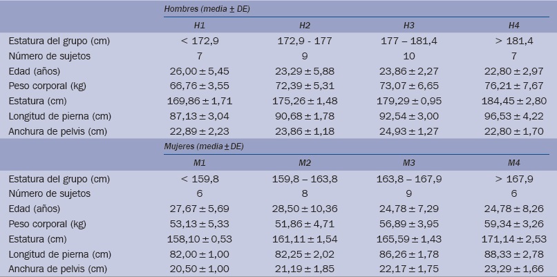 Se seleccionaron y analizaron a 62 sujetos, 29 mujeres (26,10 ± 8,18 años; 55,88 ± 4,97 kg y 165,30 ± 4,96 cm) y 33 hombres (24,00 ± 4,37 años; 72,15 ± 6,84 kg y 177,42 ± 6,07 cm) distribuidos en grupos considerando los percentiles 25, 50 y 75 de estatura de la población española (tabla 1). El primer grupo (H1 y M1) correspondió a sujetos situados por debajo del percentil 25 (<172,9 para hombres y <159,8 para mujeres), el segundo grupo (H2 y M2) se encontró entre los percentiles 25 y 50 (172,9-177 para hombres y 159,8-163,8 para mujeres), el tercer grupo (H3 y M3) lo formaron sujetos que se encontraron entre los percentiles 50 y 75 (177-181,4 para hombres y 163,8- 167,9 para mujeres) y el cuarto grupo (H4 y M4) sujetos ubicados por encima del percentil 75 (>181,4 para hombres y >167,9 para mujeres) de la estatura de la población española (Carrascosa et al., 2008). Los sujetos presentaron normopeso, encontrándose los valores de índice de masa corporal entre 18,5 y 24,9 kg/m2. Todos los sujetos participaron de forma voluntaria y firmaron el consentimiento informado para la realización de las pruebas. Los protocolos aplicados fueron previamente aprobados por el Comité de Ética de la Universidad Politécnica de Madrid. Se establecieron como criterios de inclusión el no padecer patologías crónicas del sistema musculo-esquelético y no haber sufrido lesiones recientemente.