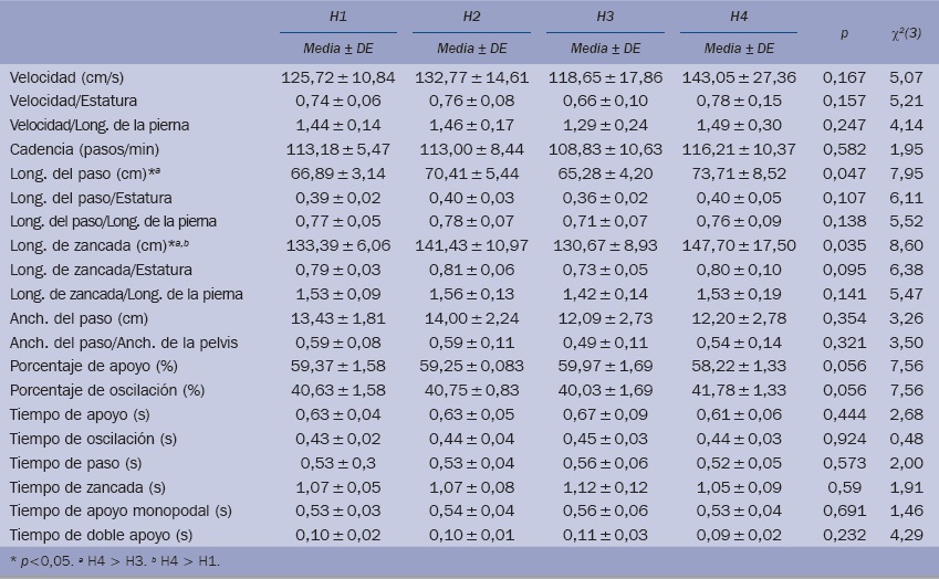 La longitud de paso (cm) se presentó diferente en los grupos de estatura de los hombres, siendo los valores en el grupo H4 mayores que los del grupo H3. La longitud de zancada (cm) presentó diferencias en los grupos por estatura de los hombres, teniendo valores mayores en el grupo H4 que en los grupos H1 y H3. Como se muestra en la tabla 2, no se encontraron diferencias en el resto de variables espacio-temporales entre los grupos de estatura de los hombres.