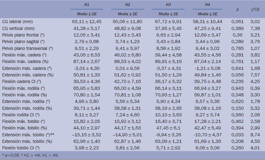 Existen diferencias en los grados de máxima extensión de tobillo entre los grupos por estatura de los hombres. El grupo H1 presentó valores inferiores que los grupos H4 y H3. Los hombres no presentaron diferencias entre los grupos de estatura en la cinemática de la pelvis, centro de gravedad, cadera y rodilla. Y tampoco en el resto de parámetros del tobillo, como se muestra en la tabla 3.