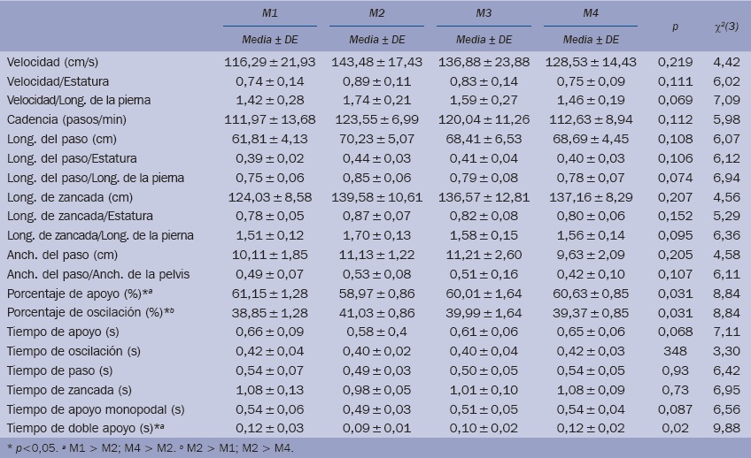 Las mujeres mostraron diferencias en el porcentaje del ciclo de apoyo entre los grupos de estatura de las mujeres, siendo los grupos M1 y M4 mayores que el grupo M2. El porcentaje del ciclo en oscilación también presentó diferencias entre las mujeres, mostrando valores mayores en el grupo M2 que en los grupos M1 y M4. El tiempo de doble apoyo mostró valores mayores en los grupos M1 y M4 que en el grupo M2. El resto de parámetros espacio-temporales no presentaron diferencias entre los grupos por estatura de las mujeres como se muestra en la tabla 4.