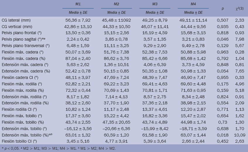 Los parámetros cinemáticos que se obtuvieron fueron: el rango de movimiento del centro de gravedad en el plano frontal (movimiento lateral, mm) y en el plano sagital (movimiento craneocaudal, mm), el rango de movimiento de la pelvis en los tres planos (°): sagital (anteversión y retroversión), frontal (caída lateral de la pelvis) y transversal (oblicuidad). En la cinemática de la flexo-extensión de cadera, rodilla y tobillo se seleccionaron datos discretos (máximos, mínimos y apoyo inicial) de las curvas ángulo articular/porcentaje ciclo, siendo estos datos los que describían con mayor exactitud la curva. Se analizaron, por tanto, los grados de flexión máxima y mínima de cadera, rodilla y tobillo (°) y el momento del ciclo en el que sucedían (% del ciclo), y los grados de flexión de cadera, rodilla y tobillo (°) en el momento del contacto del talón (0% del ciclo).