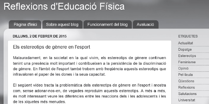 Además, se debe señalar que el uso del blog, y de las TIC en general, permite ampliar los límites espaciotemporales del aula, por lo que, como afirma Capllonch (2005), se convierten en una herramienta didáctica muy válida para tratar contenidos conceptuales y actitudinales que consideramos relevantes. Así pues, podemos abordar aspectos sociales de gran importancia en nuestro ámbito como las cuestiones de género en el deporte, los estereotipos del cuerpo y su tratamiento o los valores éticos de las actividades fisicodeportivas, sin que eso implique tener que reducir un tiempo de actividad motriz ya reducido por la escasa carga horaria que sufre nuestra materia.