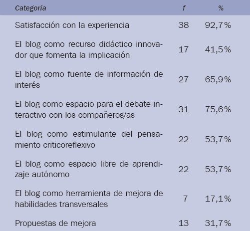 Los resultados muestran una opinión muy favorable del alumnado hacia la experiencia de uso del edublog que se ha llevado a cabo, lo que concuerda con los resultados obtenidos en otros estudios, tanto en el ámbito de ESO (Escudero, et al. 2014; Santos & Fernández, 2012) como en la educación superior (Coutinho, 2007; Molina et al., 2016).