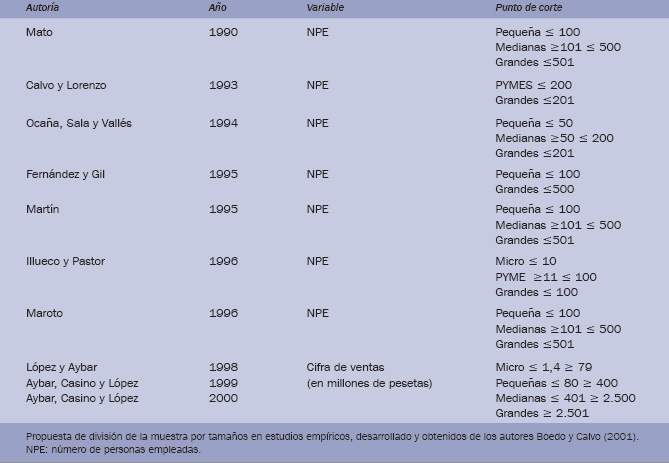 Sin embargo, los criterios para definir el tamaño de las empresas no han sido claros, y en muchas ocasiones han generado grandes problemas al personal investigador (Boedo & Calvo, 2001; Kimberly, 1976). La mayor parte de los estudios a lo largo de los años ha utilizado el NPE como criterio para definir el tamaño (tabla 1).