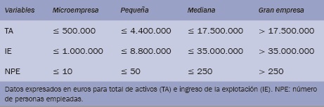 Para solventar el problema del tamaño en este estudio y conocer la dimensión de las empresas del sector deportivo nos hemos basado en la Directiva Europea 78/660/CEE (Grimaldi-Puyana, Ferrer-Cano, Bravo, & Del Pozo Cruz,2015). El análisis de las variables ingresos de la explotación, total de activos y NPE, nos permite clasificar las organizaciones de gestión de instalaciones deportivas españolas (OGIDE) según su tamaño en grande, mediana, pequeña y microempresa. Para ser clasificadas por tamaño estas deben cumplir dos de las tres variables indicadas en la tabla 2.