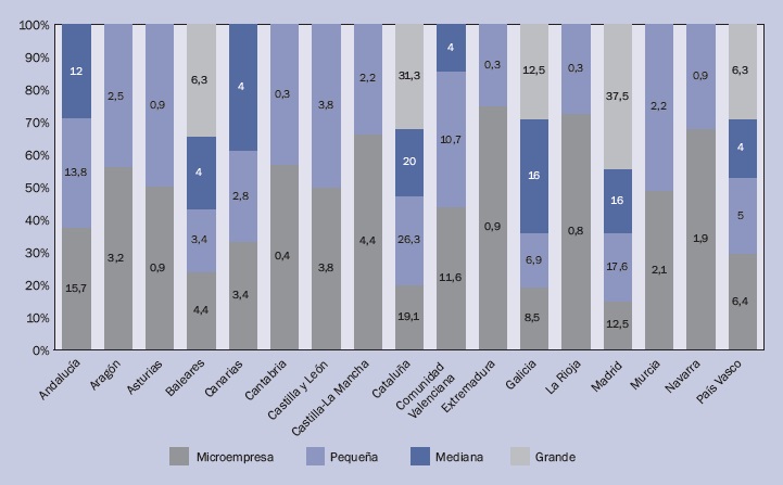 En la figura 1 podemos observar el porcentaje según tamaño de las OGIDE por comunidad autónoma. Si analizamos el territorio español, solamente en cinco comunidades autónomas tienen presencia las grandes OGIDE: Madrid (37,5 %), Cataluña (31,1 %), Galicia (12,5 %), País Vasco (6,3 %) y Baleares (6,3 %). Las medianas tienen presencia solamente en ocho comunidades: Madrid (20 %), Cataluña (16 %), Galicia (16 %), Andalucía (12 %), País Vasco (4 %), Comunidad Valenciana (4 %), Canarias (4 %) y Baleares (6,3 %). Destacar la presencia del tamaño microempresas y pequeñas OGIDE en las 17 comunidades autónomas, sin embargo, señalar que no existe ninguna en las ciudades autónomas de Ceuta y Melilla.