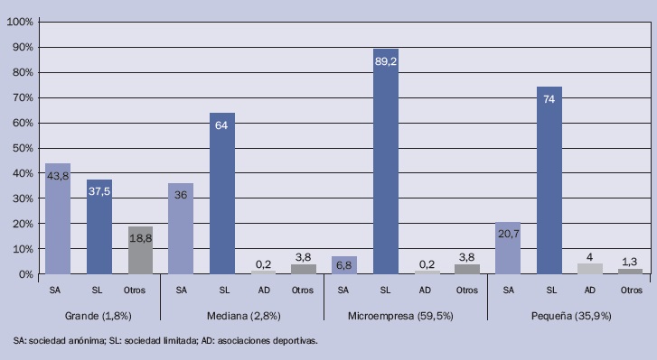 En la figura 2 podemos observar la relación tamaño (recomendación europea) y forma jurídica en España. En primer lugar, se debe señalar que 59,5 % estuvo formada por microempresas, 35,9 % pequeñas, 2,8 % medianas y 1,8 % grandes empresas. La mayoría están clasificadas como pequeñas y microempresas (95,4 %), y bajo personalidad jurídica de sociedad limitadas (mediana, 64 %; microempresa, 59,5 %; pequeña, 74 %). Las sociedades anónimas tienen mayor presencia en grandes OGIDE (43,5 %) seguido de medianas (36 %) y pequeñas (20,7 %).
