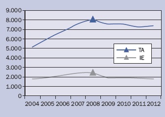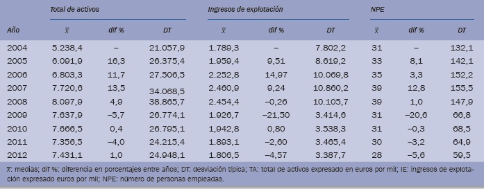 En la tabla 4, se muestra la evolución entre 2004 y 2012 del total de activos (TA), ingresos de la explotación (IE) y número de personas empleadas (NPE), expresados en valores medios y estadísticamente significativos (. < 0,001). Entre el período de 2004-2008 se produce un incremento del total de activos de 2.859,5 miles de euros (54,6 %); también se observa un incremento de los ingresos de la explotación de 665,1 miles de euros (37,2,1 %) y un aumento en el número medio de personas empleadas pasando de 30,9 a 39,3 (27,2 %) de 2004 a 2008 respectivamente. Analizando el segundo período y comparando los valores medios de finales de 2008 con 2012, se produce una disminución de todas las variables analizadas, total de activos –666,8 millones de euros (–8,2 %), ingresos por explotación –647,9 millones de euros (–35,9 %) y la media de personas empleadas de –10,9 (–27,7 %), aunque hay que destacar que estas son superiores a las registradas a principios de 2004, a excepción del NPE.