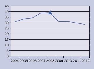En segundo lugar, se desprende de este estudio que, a pesar de que las variables analizadas han presentado una evolución positiva en su conjunto para el periodo de análisis, con excepción del NPE, existe un claro punto de inflexión en el año 2008 donde todas las variables pasan de tener una tendencia creciente positiva a negativa, como se puede apreciar en las figuras 3 y 4. Por tanto, concluimos que el ejercicio 2008 ha sido determinante en la ralentización del crecimiento de las OGIDE en España.