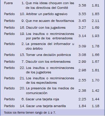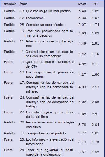En la tabla 1 se presentan los estadísticos descriptivos de los diferentes estresores planteados. Los datos se presentan ordenados de mayor a menor estrés percibido. Observamos valores medios altos (> 4) en diez estresores, seis de los cuales corresponden a situaciones de partido y cuatro a situaciones fuera de partido.
