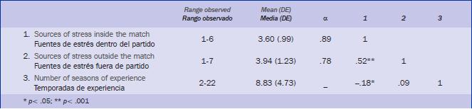 En la tabla 2se presentan las puntuaciones medias de las fuentes de estrés de dentro y fuera de partido, la media de temporadas de experiencia y las correlaciones entre variables. Al comparar las puntuaciones medias de ambas fuentes de estrés observamos una media superior para las fuentes de estrés de fuera de partido. Los resultados de la prueba . de Student muestran una diferencia de medias significativa, t (127) = –3.297, p = 0.00, d = .29. En las correlaciones se observa una asociación positiva entre las fuentes de estrés de partido y fuera de partido, y una asociación negativa entre las temporadas de experiencia y las fuentes de estrés dentro de partido. No se ha encontrado asociación entre las temporadas de experiencia y las fuentes de estrés fuera de partido.
