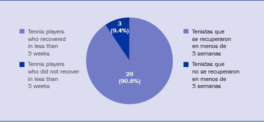 29 de los 32 sujetos sometidos al programa de ejercicio para el tratamiento del síndrome sabacromial (90.6%), se incorporaron con éxito a los entrenamientos, retomando así mismo las competiciones deportivas en un período inferior a 35 días. Además, pudieron ejecutar el servicio y el remate con ausencia de dolor en su hombro dominante. Previa incorporación a la práctica deportiva, a los 29 sujetos que se encontraban asintomáticos se les efectuó nuevamente la “maniobra del arco doloroso” y la “maniobra de Jobe”, obteniendo todos ellos resultado negativo. El tiempo medio de recuperación fue de 19 días (±4.17). Transcurridos 35 días desde el inicio del tratamiento, 3 de los sujetos participantes en el estudio (9.4%) presentaban molestias ocasionales tras la práctica del servicio, de modo que fueron remitidos a los servicios médicos.