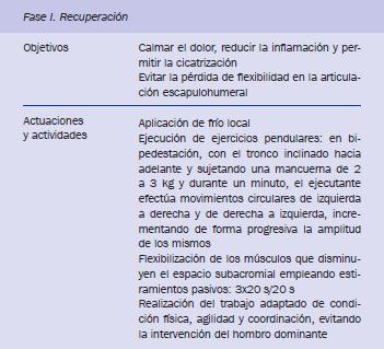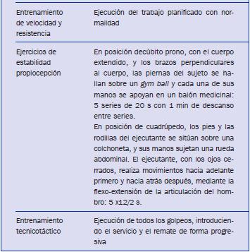 En virtud de este análisis, el trabajo de fuerza de la musculatura escapular se centró preferentemente en la tonificación de la musculatura extensora y rotadora externa de la articulación escapulohumeral. Los movimientos de rotación interna y aducción se realizaron con moderación. Y por contra, se incidió en la flexibilización de los músculos flexores y abductores de la mencionada articulación.