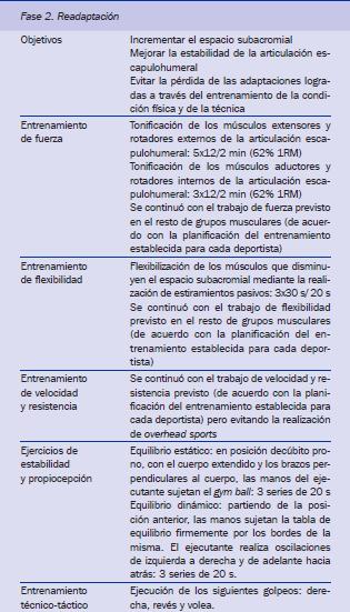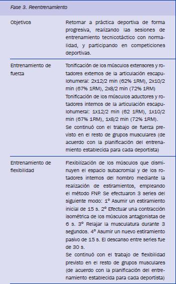 3. Realización de trabajo adaptado a la lesión durante todo el proceso de tratamiento. Dado que las adaptaciones logradas a través del entrenamiento son reversibles, durante los periodos de necesario reposo de la articulación escapulohumeral, se trató de continuar en la medida de lo posible con el trabajo tanto de condición física como con el entrenamiento a nivel coordinativo. Para lograr este objetivo, se hizo uso de ejercicio físico adaptado, puesto que se buscaba evitar la pérdida de las adaptaciones (técnicas, tácticas, físicas y psicológicas) logradas en el proceso de entrenamiento, mejorar la eficacia del tratamiento y favorecer el rápido retorno a la práctica deportiva.