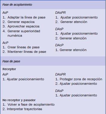 En las dos fases expuestas, el jugador que se desmarca deberá interpretar las diferentes interacciones que se producen a nivel de colaboración y en función de la dialéctica ataque-defensa, teniendo en cuenta que los objetivos tácticos se enfrentan de manera sincrónica.