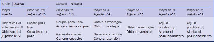 En la tabla 3 se especifican los objetivos en base a la interacción del jugador número 9, respecto al resto de jugadores con los que interviene en la figura 2.