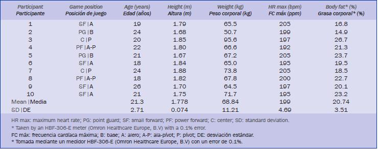 La muestra de este estudio estuvo formada por diez jugadoras (n = 10) de baloncesto amateur (edad: 21.3 ± 2.71 años; peso: 68.84 ± 11.21 kg; talla: 177 ± 7 cm; grasa corporal: 20.74 ± 3.51%; experiencia: 10 ± 3.12 años). Las 10 jugadoras realizaban 3 sesiones semanales de entrenamiento de 2 h cada una, con 48 h de recuperación entre estas y un partido durante el fin de semana, que se disputaba en sábado o domingo en función del calendario. Además, participaron en este estudio sin recibir recompensa económica o en especie y firmaron un documento de consentimiento informado. Ninguna de las participantes sufrió ninguna lesión durante los 6 meses previos al estudio, ni siguiendo dieta alimentaria, ni sufría alteración respiratoria y/o metabólica en el momento de su realización. Este estudio se diseñó teniendo en cuenta los principios de la Declaración de Helsinki de 1975, revisada en el año 2000.