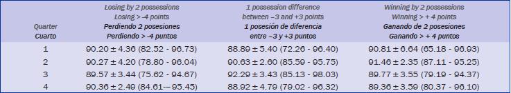 Además, los resultados obtenidos en este estudio sugieren que en el primer, segundo y tercer periodo predominan las acciones medias y largas, mientras que en el último periodo las acciones que predominan son las medias y cortas siendo estas últimas más abundantes (7.86 ± 5.26 posesiones por cuarto) cuando se va perdiendo de más de 1 posesión o cuando se va por delante en el marcador por más de una posesión (5.00 ± 3.80 posesiones por cuarto), lo que podría sugerir una tendencia a que el juego se acelere cuando cualquiera de los dos equipos va por detrás en el marcador a medida que el tiempo disponible se agota.
