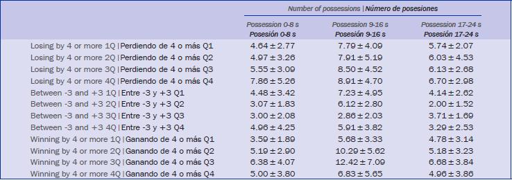 Por otro lado, en este estudio se calculó el número medio de posesiones que se producían en función del marcador, del cuarto, y del tipo de posesiones (cortas de 0-8 s, medias de 9-16 s y largas de 17-24 s), con la intención de conocer si las diferencias observadas anteriormente en la diferenciación por estratos provenían de los diferentes tipos de posesiones o si realmente eran fruto únicamente de la diferencia de puntos. Los resultados del análisis muestran que solo existen diferencias significativas en las posesiones largas respecto al número de posesiones (p < 0.01), lo que sugiere que las diferencias únicamente provienen del resultado del partido, cuando las posesiones son cortas o medias. Estos resultados deberían ser interpretados con cautela, ya que el efecto fisiológico de las acciones de corta y media duración dependerá enormemente de la intensidad a la que se desarrollen (Wiewelhove et al., 2016), de la duración de las pausas de recuperación entre acciones (Nikolaidis, Meletakos, Tasiopoulos, Kostoulas, & Ganavias, 2016; Padulo, Tabben et al., 2015), del tipo de oposición que realizan los contrarios (Sánchez-Sánchez et al., 2016), de las características del tipo de desplazamiento (acciones lineales o con cambio de dirección) (Padulo, Laffaye et al., 2015), o del tipo de patrón de movimiento realizado (Tomazin, Morin, & Milllet, 2016), lo que hace altamente variable el tipo de acciones.