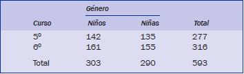 La muestra participante queda reflejada en la tabla 1, constituida de la siguiente manera: en función del género 290 chicas (48.9%) y 303 chicos (51.1%). En cuanto al curso, 277 son de 5º (46.7%) y 316 son de 6º de educación primaria (53.3%). Las edades oscilan entre los 9 y los 13 años, siendo la edad media 10.86.