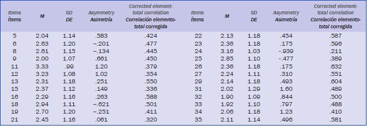 La fiabilidad del cuestionario, medido a través del ade Cronbach, fue de .852. A pesar de que dicha fiabilidad era muy alta, se procedió a eliminar los ítems que presentaban bajas correlaciones (<.25). Por esto, se eliminaron los ítems 1, 2, 3, 4, 7, 10, 14, 17, 20, 28 y 30, quedando el cuestionario con 24 ítems.