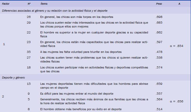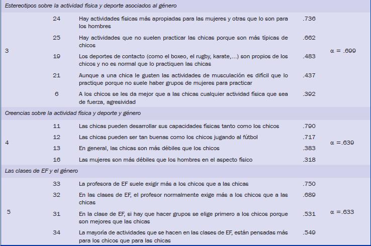 Respecto a la validez del instrumento, los datos concluyen que en el cuestionario aparecen 5 factores. Siguiendo a Morales (2010), para que el análisis factorial tenga sentido deben cumplirse dos condiciones básicas: parsimonia e interpretabilidad. Según el principio de parsimonia, el número de factores debe ser lo más reducido posible y estos deben ser susceptibles de interpretación sustantiva, condiciones que el cuestionario propuesto cumple. De esta manera, en el CEGAFD se encuentran los siguientes factores: 1, Diferencias asociadas al género y su relación con la actividad física y el deporte; 2: Deporte y género; 3: Estereotipos sobre la actividad física asociados al género; 4: Creencias sobre la actividad física y deporte y 5: Las clases de EF y género, oscilando los coeficientes α de Cronbach en todos los factores desde muy buenos a aceptables.