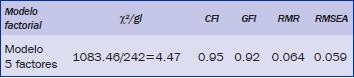 Posteriormente, tomando como base los resultados obtenidos en el AFE expuesto anteriormente, se realizó el AFC para someter a prueba el modelo de los 5 factores, con el programa LISREL 8.8. Para ello, se midió la bondad de ajuste del modelo propuesto a través de diversos indicadores. Así, se utilizó chi-cuadrado dividida por los grados de libertad, el promedio de los residuales (RMR) y el de los residuales estandarizados (RMSEA). Además, otros indicadores empleados fueron el índice de bondad de ajuste (GFI) y el índice de ajuste comparativo (CFI) ya que son los índices más usados por estar menos afectados por el tamaño de la muestra (García, Gallo, & Miranda, 1998).