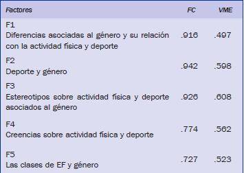 El AFE muestra la existencia de 5 factores claramente delimitados que explican el 49.72% de la varianza total, siendo esta proporción aceptable. Además, las comunalidades de los ítems están por encima de h2 = .30 oscilando entre .321 “El hombre obtiene más beneficio por su esfuerzo en el deporte” a .678 “En clases de EF, el profesor normalmente exige más a los chicos que a las chicas”