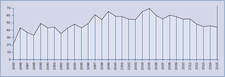 Tal y como se muestra en la figura 1, el número de publicaciones ha ido en aumento desde sus inicios en 1985 hasta finales de los años 90, produciéndose un leve descenso para luego ascender nuevamente hasta el año 2005, en el que se alcanzó el máximo número de trabajos publicados, los cuales ascendieron a un total de 69. Durante los últimos años se ha producido un descenso en el número de publicaciones por número, situándose en 34 el número de trabajos publicados en el año 2015.