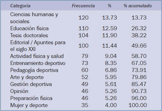 A lo largo de las tres décadas de actividad de la revista, se han establecido un total de 81 áreas temáticas o categorías que cubren un amplio abanico de ámbitos diversos relacionados con la educación física y el deporte, poniendo de manifiesto el carácter multidisciplinario de la revista.