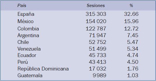 Durante el período 2013-2015, el número de accesos a la revista medido en sesiones en línea fue de 965 263, en un total de 100 países. En la tabla 2se muestran los diez países desde los que se han realizado un mayor número de accesos a la revista. Es importante destacar la notable visibilidad de la revista en países latinoamericanos. El 81.4% de las sesiones fueron realizadas por nuevos visitantes y el número total de páginas vistas en este trienio ascendió a 1 799 937.