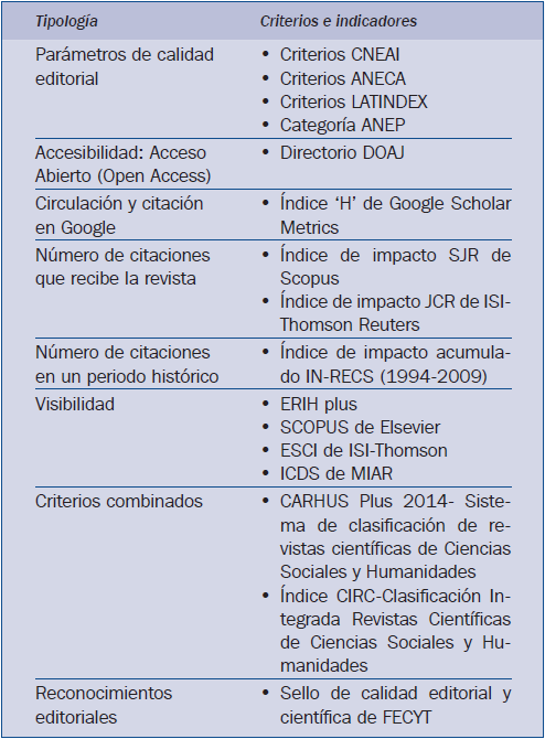 1) En relación con los indicadores estructurales y formales de las revistas analizadas hemos acudido a los criterios de calidad incluidos en la base de datos RESH que integra las evaluaciones de las agencias nacionales más importantes en la valoración de revistas, proyectos de investigación, acreditaciones de profesores e instituciones universitarias: a) Comisión Nacional Evaluadora de la Actividad Investigadora (CNEAI); b) Agencia Nacional de Evaluación de la Calidad y Acreditación (ANECA); c) Latindex, base de datos creada para evaluar y clasificar las revistas españolas e iberoamericanas en función de un número de criterios cumplidos de acuerdo con los estándares de calidad básicos establecidos (33 o 36 criterios máximos, en función de si son revistas editadas en papel o formato electrónico); d) (ANEP), que valora las revistas en las siguientes categorías: A+, A, B y C (Reverter et al., 2012). No obstante hay que advertir que excepto la base de datos de Latindex, las demás y las clasificaciones de las otras agencias no están actualizadas.
