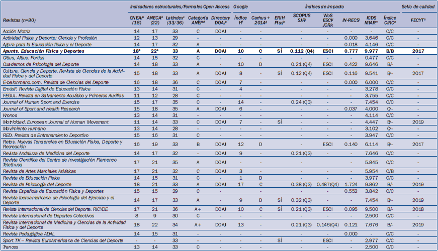 En el contexto actual existe una gran variedad de revistas técnicas y científicas españolas que publican trabajos en el ámbito de las ciencias de la actividad física y el deporte. Con el objetivo de contextualizar la revista Apunts. Educación Física y Deportes en este universo de publicaciones se ha realizado un análisis comparativo entre las 30 revistas consideradas a través de su presencia y valor en 14 parámetros según la tipología establecida que estructuramos así: indicadores estructurales y formales (4); directorio DOAJ de Open Access (1); índice H de Google (1); índices de impacto (7); sello de calidad (1) –véanse las tablas 3 y 4–. El estudio se realizó entre los meses de septiembre y noviembre de 2016 por los autores mediante consulta por Internet de las páginas web de los directorios oficiales y de las bases de datos bibliográficas, así como de las revistas consideradas en la muestra a través de su web. Los datos obtenidos fueron contrastados y enriquecidos con los obtenidos de las fuentes bibliográficas referenciadas.