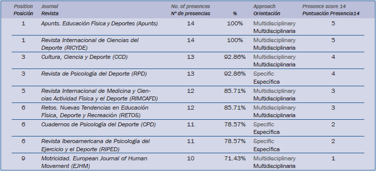 Las 30 revistas de ciencias de la actividad física y el deporte de la muestra presentan un nivel de presencia desigual en los 14 indicadores del análisis multifactorial. Destacamos las nueve revistas (30%) que están por encima de las 10 presencias y que presentan un nivel notable en el conjunto de indicadores multifactoriales escogido, a continuación se encuentran seis revistas intermedias (20%) entre 8 y 9 presencias y el resto que corresponde a quince revistas (50%) con presencia insuficiente en la media de indicadores. Hay que reseñar también que en el conjunto de la muestra hay tres revistas (10%) con denominación en lengua inglesa, pero es importante remarcar que prácticamente todas las publicaciones relevantes presentan de forma habitual algún artículo o incluso todos en lengua inglesa de forma paralela a la edición en español. Entre las nueve revistas más destacadas encontramos seis de carácter multidisciplinario y tres orientadas a la psicología del deporte.