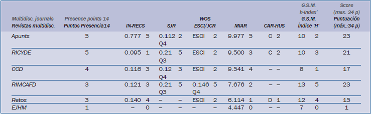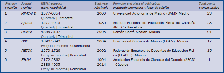 Las publicaciones más valoradas son RIMCAFD y Apunts, con la misma puntuación, seguida por RICYDE a corta distancia. Estas tres revistas son trimestrales por lo que mantienen una frecuencia de edición destacable y una producción científica elevada. A continuación tenemos dos revistas con puntuación intermedia CCD y RETOS pero con presencia en los indicadores de calidad y buenas expectativas y con presencia testimonial en esta tabla EHJM. Las cinco revistas primeras están presentes en alguna de las tres bases de datos recomendadas y exigidas por las agencias nacionales de evaluación: ISI-Thomson, Scopus, ERIH. Subrayamos además que hay tres revistas que están presentes en las tres bases de datos citadas como más valoradas por las agencias nacionales de evaluación y valoración de revistas: Apunts, CCD y RICYDE. Los entes que promueven a estas seis revistas son variados: universidades y departamentos (3), asociaciones y federaciones (2), editor independientes (1); y lugares de edición corresponden a Madrid, Barcelona, Murcia (3) y Cáceres.