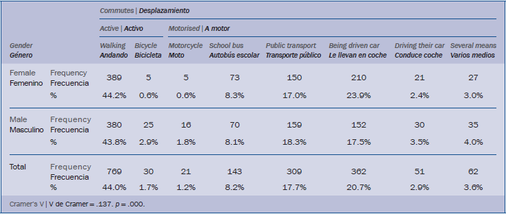 Existen diferencias significativas, aunque muy débiles, en el tipo de desplazamiento empleado por ellas y por ellos (V de Cramer = 0.137; p = 0.000) (tabla 1).