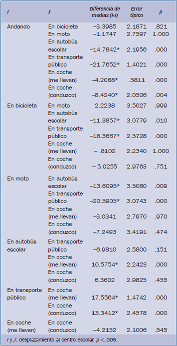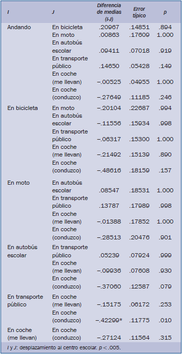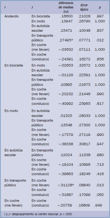El Anova de un factor detecta que existen diferencias significativas en la cohesión familiar en relación con el medio de transporte utilizado para ir al centro de estudios (p = 0.006) (tabla 2). Estas diferencias se centran únicamente entre dos pares: ir andando frente a ir en transporte público e ir en transporte público frente a que le lleven en coche.