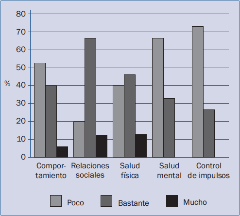 El 53.3% opina que los sujetos han mejorado poco su comportamiento en el centro, el 40% que lo han hecho bastante y el 6.7% restante, mucho. En cuanto a las relaciones sociales el 66.7% lo han hecho bastante y el 13.3% mucho. El 46.7% de los tutores considera que han mejorado bastante su salud física. Cuando preguntamos por la salud mental, hay casi siete de cada diez niños que no han obtenido mejoras significativas en esta vertiente. Finalmente, y analizando el control de impulsos, observamos que el 73.3% ha mejorado poco.