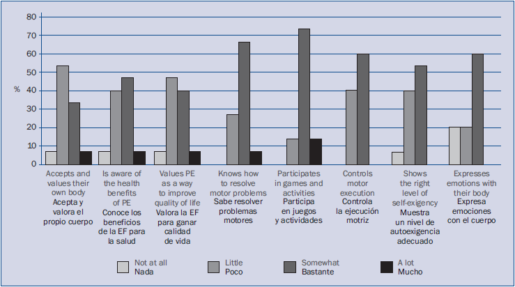Aunque se han observado mejoras en la conducta, donde los porcentajes han sido más altos es en las relaciones sociales, la salud física y la autoestima. Asimismo, somos conscientes de que la actividad física es solo uno de los elementos que favorecen estos cambios (adaptación al centro, nueva escuela o alejamiento del foco del problema). Por lo tanto, considerando que la práctica física es una vía para adquirir hábitos de conducta y actitudes, pensamos que esta dimensión debe mejorarse.