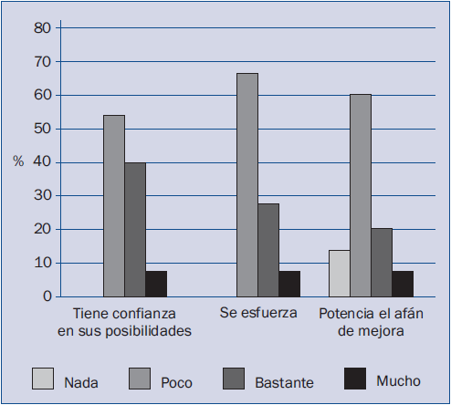 El esfuerzo y el afán de mejora personal están íntimamente ligados con la confianza que uno tiene. Al preguntar si el niño se esfuerza, hay un claro desequilibrio: 66.7% poco, 26.7% bastante y 6.6% mucho, que todavía es más amplio si preguntamos por el afán de mejora: 73.3% nada y poco, y 20% bastante.
