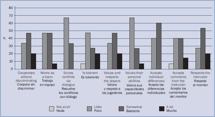 Los mismos sujetos estudiados no se valoran bien. Un 66.7% valora poco sus capacidades personales con respecto a las relaciones sociales. El 60% acepta bastante las diferencias individuales. La situación cambia un poco cuando entra en juego la figura del entrenador. Aceptar los comentarios, sugerencias y correcciones de otra persona es una realidad que les cuesta (13.3% mucho; 40% bastante; 40% poco y 6.7% nada). De todos modos, se observa un aumento de niños y adolescentes que respetan al monitor o al entrenador (20% mucho, 53.3% bastante).