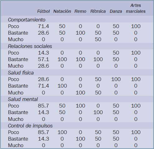 La rítmica y el remo son considerados los deportes más apropiados para mejorar el comportamiento. Se trata de dos actividades individuales, muy técnicas y que requieren una gran precisión de movimientos y manejo de objetos. El fútbol es considerado como el deporte, de los mencionados, donde más mejoran las relaciones sociales (85.7% entre bastante y mucho); seguido de la natación, el remo y la rítmica con el mismo porcentaje. La danza queda relegada a los lugares de la cola, ya que el 50% de los niños ha mejorado poco sus amistades con esta actividad. Con respecto a la salud física, la rítmica muestra valores bastante diferenciados, el 50% se mueve en el poco y el otro 50% en el mucho. Los valores expresados en la natación son positivos, la totalidad se encuentra en la casilla de bastante. El fútbol ha adquirido protagonismo en esta dimensión y un porcentaje superior al 70% considera que los niños han mejorado bastante. Finalmente, tenemos el remo, donde el 100% se sitúa en mucho. En este caso se observa que aquellos deportes que generan más gasto energético, es decir, más exigencia física (remo, fútbol y natación) son los que han contribuido más a tener una mejor salud. Los tutores del centro consideran que en ningún caso el deporte ha ayudado mucho a tener una mejor salud mental.4 Solo los niños y adolescentes que hacen rítmica han obtenido una mejora en su salud mental (100% al nivel de bastante), seguidos de la natación y la danza. Las artes marciales, la natación y el fútbol nos resultan poco útiles para el control de impulsos. La rítmica y la danza se mueven equitativamente entre el poco y el bastante y el remo se sitúa en primera posición.