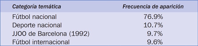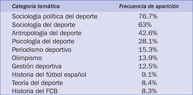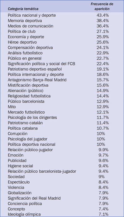 Una vez categorizadas las 700 referencias que conforman la obra deportiva montalbaniana se ha calculado la frecuencia de aparición de cada una de ellas (expresada en porcentaje respecto del total de textos). De este modo se han podido ordenar las categorías según su importancia. Por otro lado, se han considerado significativas las frecuencias superiores al 7.1%, es decir, las de aquellas categorías que aparecen en más de 50 textos.