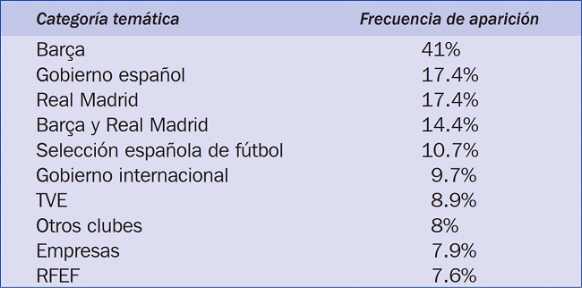 La tabla 2 muestra como el FCB (41%) es, con diferencia, la institución más tratada. A continuación, destacan las alusiones a los sucesivos gobiernos españoles (17.4%) y al Real Madrid (17.4%). El FCB y el Real Madrid aparecen relacionados en el 14.4% de los escritos. También resultan significativos los comentarios sobre la selección española de fútbol (10.7%), los gobiernos internacionales (9.7%), la televisión pública española (8.9%), los otros clubes de fútbol (8%), las empresas multinacionales (7.9%) y la Federación Española de Fútbol (7.6%).