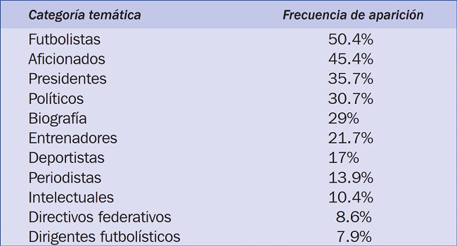 En cuanto a las personas, en la tabla 3 se observa como las principales categorías responden a los diversos agentes implicados en el mundo del fútbol: los futbolistas (50.4%), los aficionados (45.4%), los presidentes de clubes (35.7%), los entrenadores (21.7%) y, en menor medida, los dirigentes futbolísticos (7.9%). Sin embargo, también cobran protagonismo los políticos (30.7%), los datos autobiográficos (29%), los deportistas (17%), los periodistas (13.9%) y, sorprendentemente, los intelectuales (10.4%), un grupo social ajeno al deporte.