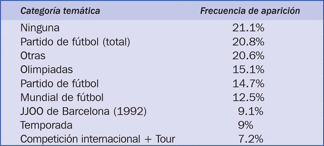 En la tabla 4 se aprecia como el contenido de una gran parte de los textos deportivos montalbanianos no incluye una referencia a un hecho o acontecimiento deportivo (21.1%). Además, en otro 20.6% se abordan cuestiones relacionadas con el universo deportivo pero sin tratarse de ninguna competición. Entre los enfrentamientos deportivos, los más significativos son los partidos de fútbol (20.8%) y los grandes encuentros internacionales como las Olimpiadas (15.1%), sobre todo los JJOO de Barcelona (1992) (9.1%), los mundiales de fútbol (12.5%) o las competiciones de otros deportes incluyendo el Tour de Francia (7.2%). También es relevante el análisis de la temporada futbolística (9%).