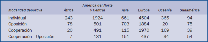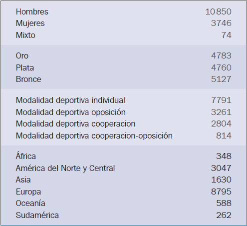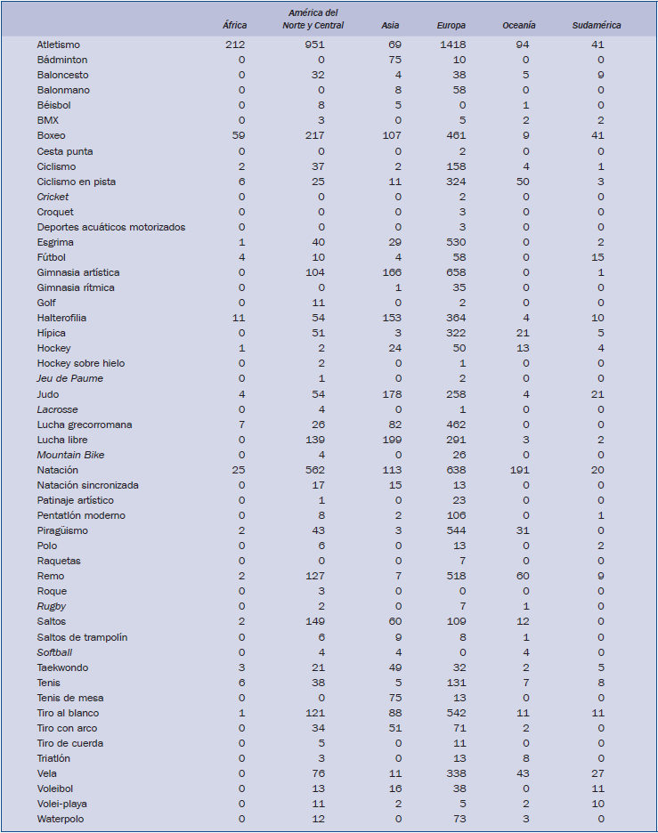 Los datos acerca de la procedencia de los medallistas y las especialidades deportivas que estos practican señalan (tabla 13) que los de Europa, Asia y América del Norte y Central han sido premiados en casi todas las especialidades deportivas, mientras que los medallistas de África, Oceanía y Sudamérica consiguen sus premios en unas especialidades deportivas determinadas.