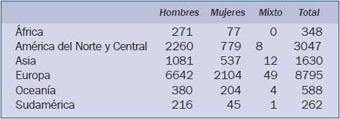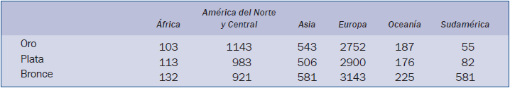 Considerando el medallero de los juegos olímpicos y la procedencia de los deportistas (tabla 11), Europa ha conseguido el mayor número de medallas, seguida, por orden decreciente, de América del Norte y Central, Asia, Oceanía, África y Sudamérica. La clasificación sigue los criterios olímpicos, según los cuales se compara, en primer lugar, el número de medallas de oro, en segundo, la de medallas de plata y, por último, las de bronce.