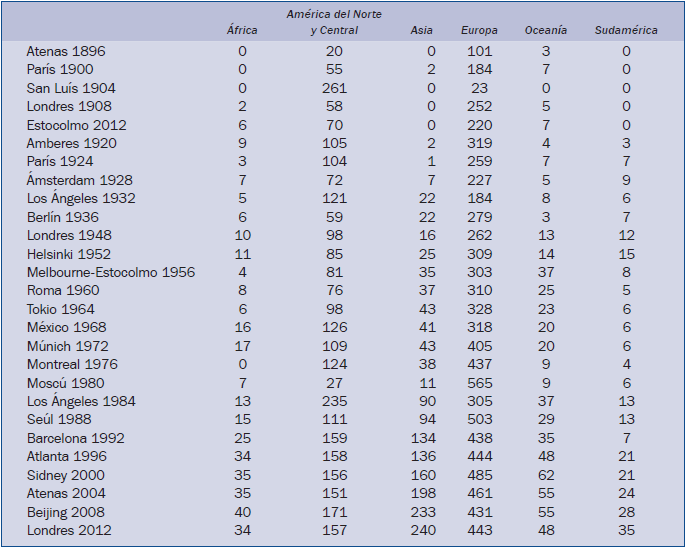 La tabla 12 permite apreciar el número de medallas obtenidas por los deportistas en función de su procedencia en todas las olimpiadas modernas. Se observa que tan solo Europa y América del Norte y Central obtuvieron medallas en todas las ediciones. El continente de Oceanía únicamente no logró ninguna medalla en los JJOO de San Luís, en 1904.