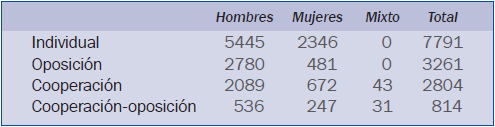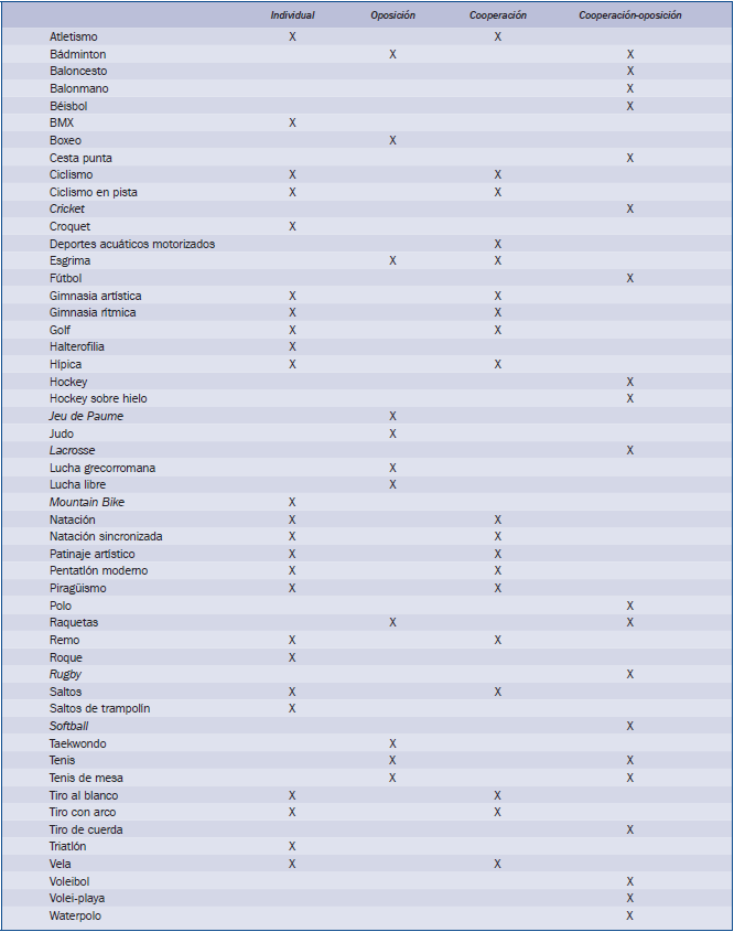 La clasificación que se empleó para catalogar las especialidades deportivas en la presente investigación es la elaborada por Blázquez & Hernández (1984); esta agrupa a los deportes en individuales, de oposición, de cooperación y decooperación-oposición. Se ofrece, en la tabla 1, la ubicación de las especialidades deportivas olímpicas, tanto si forman parte de los juegos olímpicos actuales como si ya no pertenecen al conjunto de especialidades deportivas en dicha competición, dentro de los grupos indicados. Cabe señalar que algunos de los deportes se hallan clasificados en varias modalidades debido al tipo de pruebas o estilos de competición que ofrecen o han ofrecido.